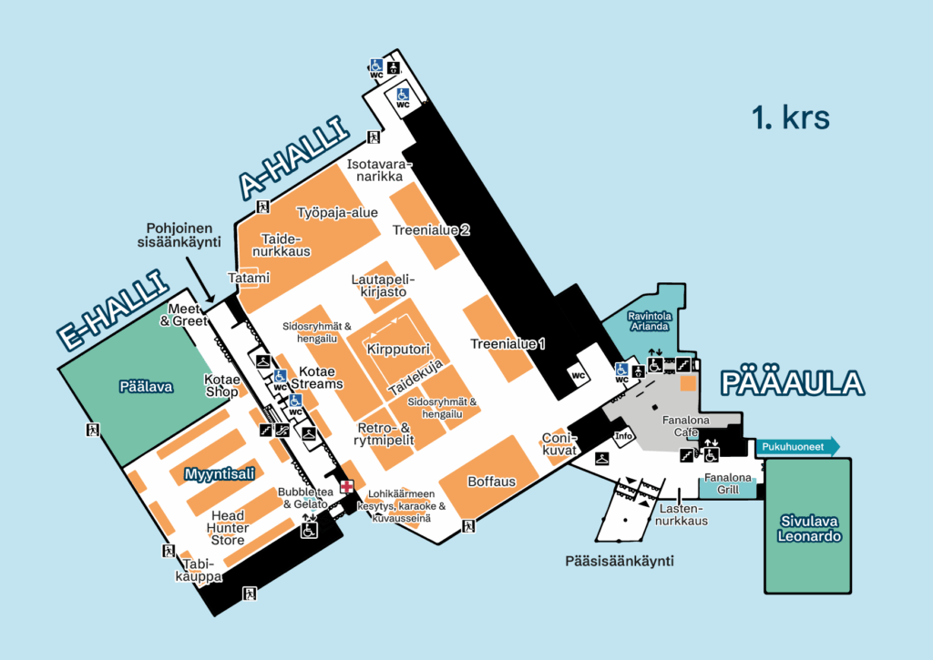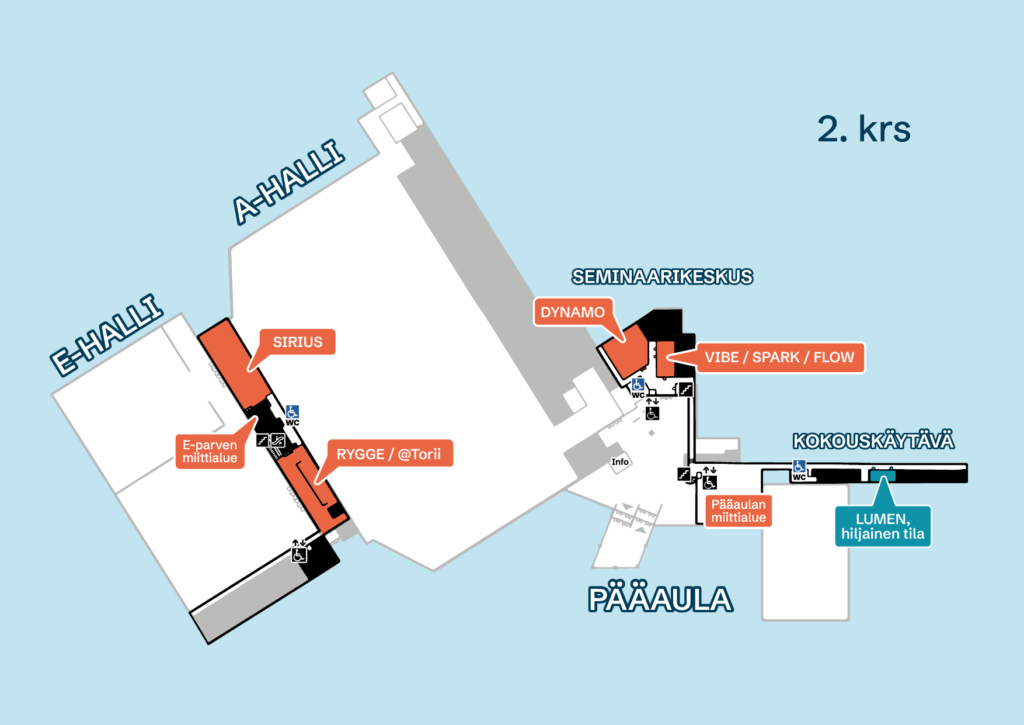 Tapahtuman käytössä ovat A-, ja E-hallit, D-halliin lukeutuva sivulava, sekä 2. kerroksen Seminaarikeskuksen, Kokouskäytävän, Siriuksen ja Ryggen tilat. Tutustu tapahtumapaikan karttoihin ennakkoon tämän sivun alalaidasta.